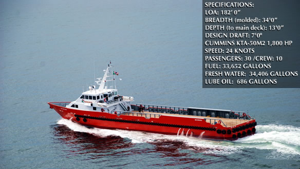 for Pemex Exploration and Production. Fitted with two bow thrusters, they have superior slow speed maneuverability. The vessels’ Project Manager states, “These two vessels provide our customer with the fastest, most technologically advanced Supply Vessels in their fleet. They can quickly deliver a large quantity of supplies on their 3,010 square foot deck, 42,337 gallons of liquid mud in eight separate tanks and 32,976 gallons of drill water in four tanks. These are impressive boats!”